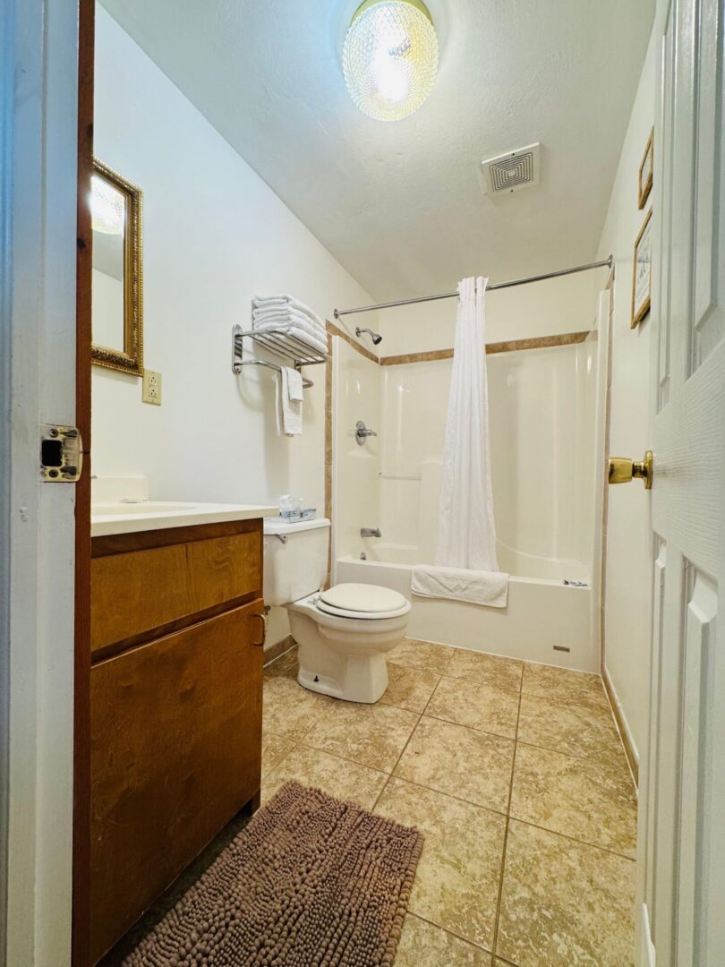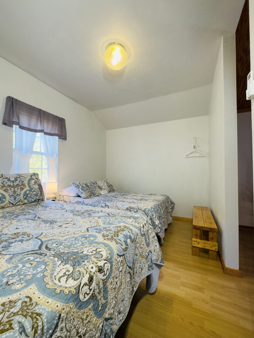 While it is an open-plan cabin, there is a separate bedroom with a queen and double bed as well as a private bathroom. All bathroom and bed linens are provided, as well as a hairdryer and personal care supplies (e.g., shampoo).