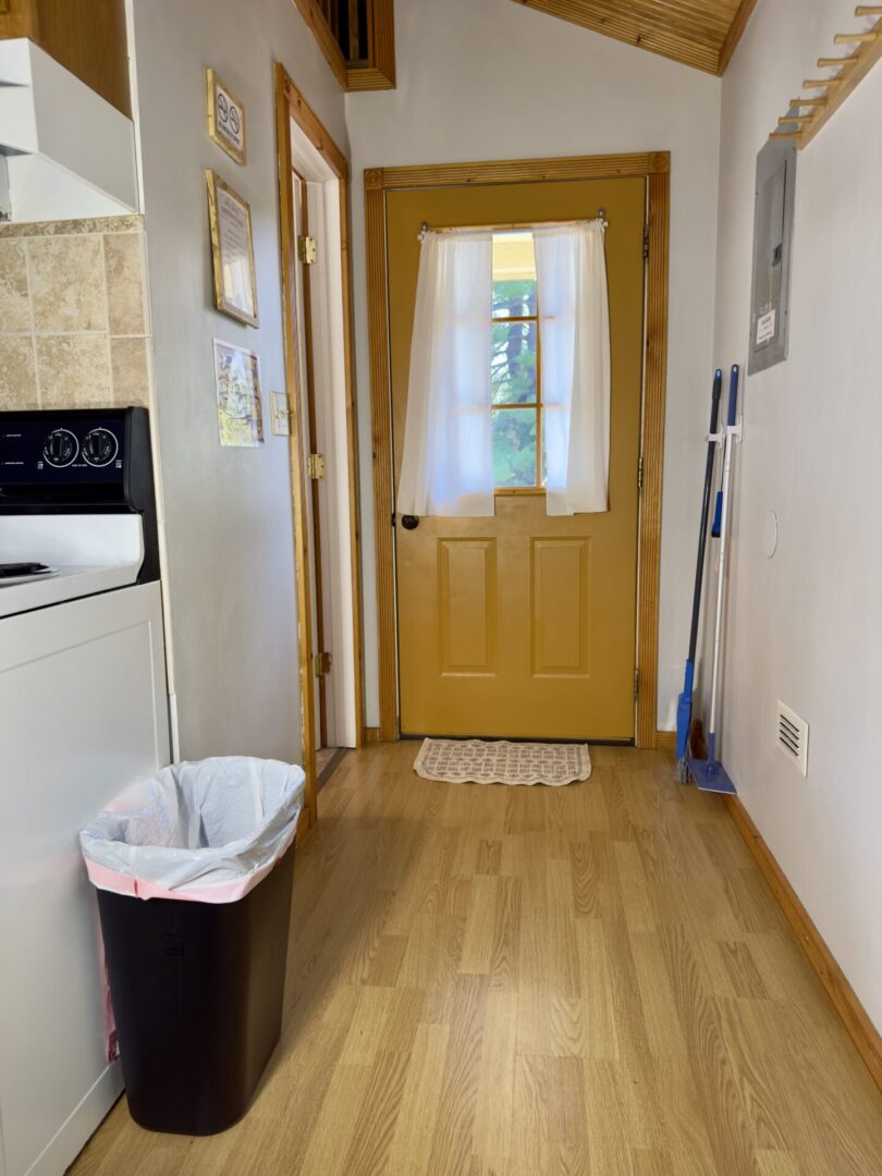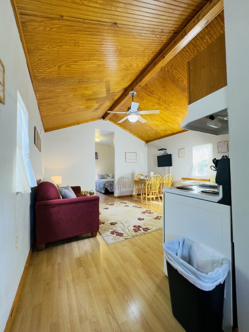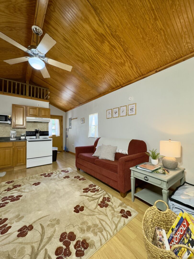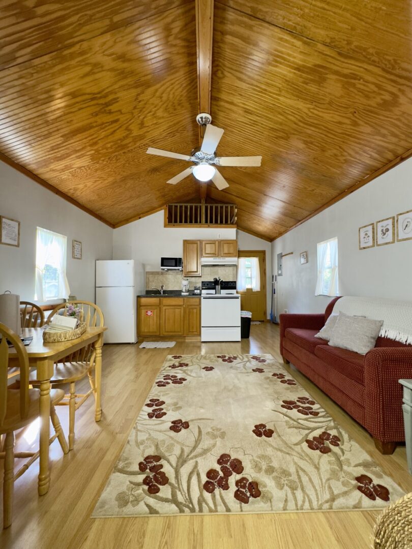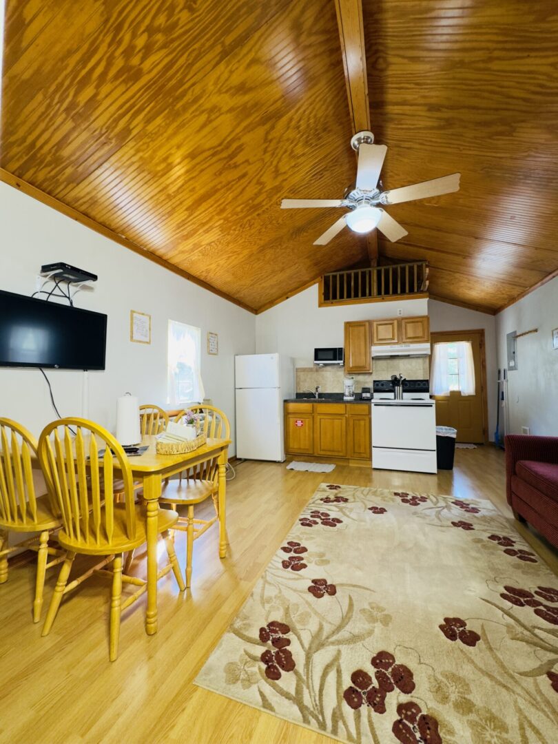 Cabin 10-14 are modern river cabins, with covered porches, located in a row near the river. These cabins have a fully equipped kitchen (e.g., dishes), and linens and supplies (e.g., dish soap). Each has a full-size fridge and a dining table. The open plan living area is comfortably furnished, with a sofa sleeper, and has a TV with cable.