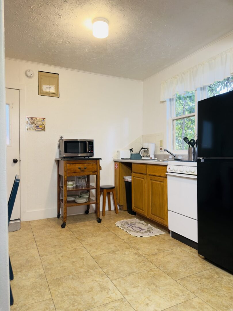 The interior of the cabin has a beautiful “decorative” stone fireplace (not open to use), with original wood floors, and such. This cabin has a fully equipped kitchen (e.g., dishes), and it has linens and supplies (e.g., dish soap). It also has a full-size fridge and a dining table. The living room is comfortably furnished and has a TV with cable.